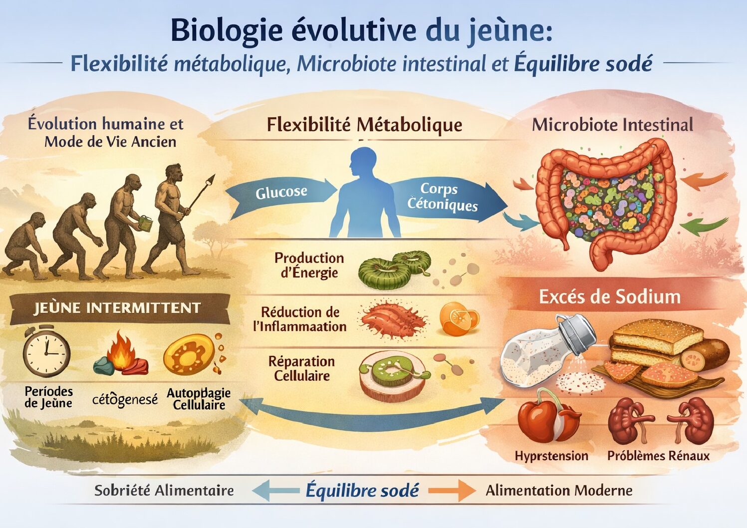 L’ensemble de ces données met en évidence un décalage croissant entre une biologie façonnée par l’évolution et des environnements alimentaires modernes caractérisés par l’abondance, la transformation et l’excès de sodium. Le jeûne, replacé dans ce cadre évolutif, apparaît comme un outil pertinent de régulation métabolique, permettant de réactiver des mécanismes physiologiques anciens aujourd’hui sous-sollicités.